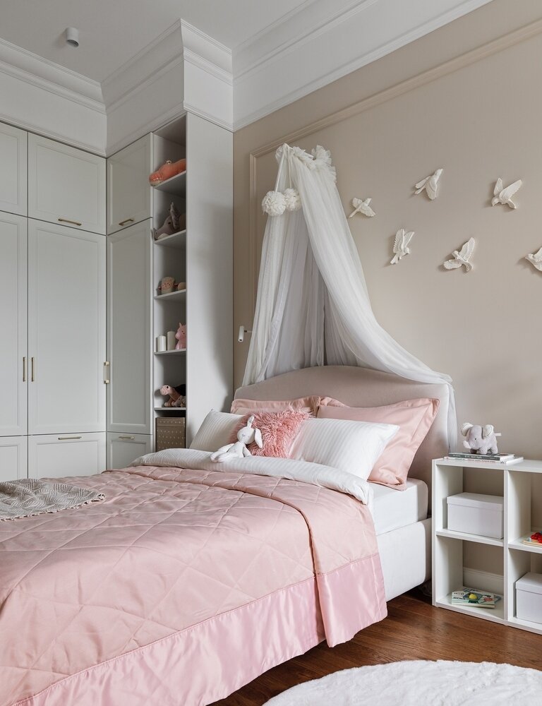 В детской встроенная гардеробная система: она изначально была определена планировкой и под нее был сконструирован ГКЛ-короб на потолке.